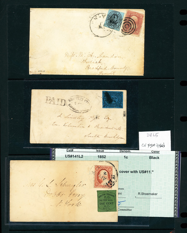 Carriers and Locals Group of Stamps and Covers, strength in covers including Nos. LO2 & 11 on cover (Weiss 2009), 1LB9 tied by pencil "x" and used with 3¢ 1857 (2), 15L13 with #11 to Princeton, 15L18 on No. U9 to Brooklyn, oxidized 20L9(?) on June 14, 1856 written by George Bancroft, 20L18 used with #65, 20L53 (2), 28L5, 75L5 tied, 141L2 (not tied, with #11, PSE cert), stamps including Nos. 4LB21, 9L1 (used). 28L2 tete beche (crease), 34L2, 95L1. 105L1. 106L1 (used), 116L2, and 87L46 block of 24, couple faults as always but all appear sound, generally Fine to Very Fine, fully imaged online. Shipping charges apply - weight 0.8 lbs. Scott $7,500+. (PDF for this Lot) (Image)