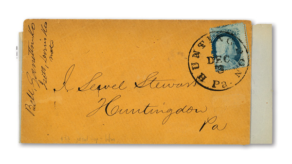 1857, 1¢ blue, type IV (Scott 23), clear recut line at top, "20L11" plating on top backflap, centered to bottom left and with mostly intact perfs at right showing the line between panes, tied by boldly struck "Huntingdon Pa. Dec. 3" circular datestamp on locally addressed buff cover with reminder notice for an outstanding invoice, Fine stamp on a Very Fine cover. Scott $1,000. (Image)