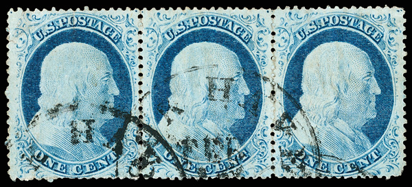 1857, 1¢ blue, type IV (Scott 23), positions 2-4L1L, horizontal strip of 3, fresh and clean with alluring color and town postmarks, each well centered; corner creases at top left, otherwise Very Fine, with 2025 P.F. certificate. Scott $2,700. (Image)