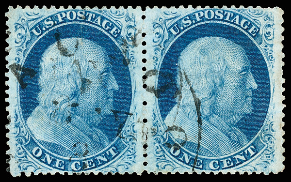 1857, 1¢ blue, type IIIa (Scott 22 var.), plate 11, eye-catching with solid centering and intense color, Very Fine, with 2012 P.S.A.G. certificate for pair, this position 2. Scott $525. (Image)