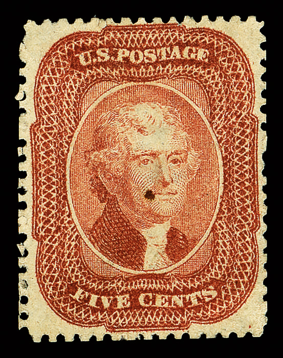 1858, 5¢ brick red, type I (Scott 27), Retains full luster, unused without gum; tiny corner crease at bottom right and a natural inclusion at center, Very Fine, with 2012 P.F. certificate. Scott $20,000. (Image)