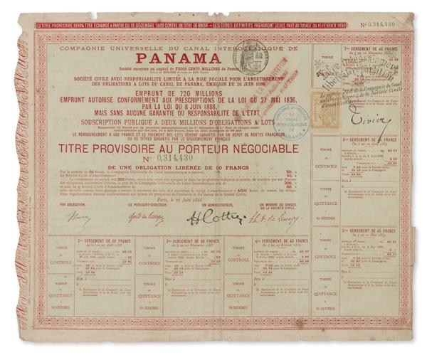 1888, Lesseps Panama Canal Co. Stock Certificate, a provisional negotiable bearer security for a released bond (obligation libérée) of 60Fr; black Seine revenue paper handstamp, the red three-line handstamp below indicating payment was authorized in accordance with the law of July 1, 1893; "Panama Inter-Oceanic Canal Co." control stamp tied by fancy bilingual payment handstamp; edge faults and some soiling, but an interesting piece of history. (Image)