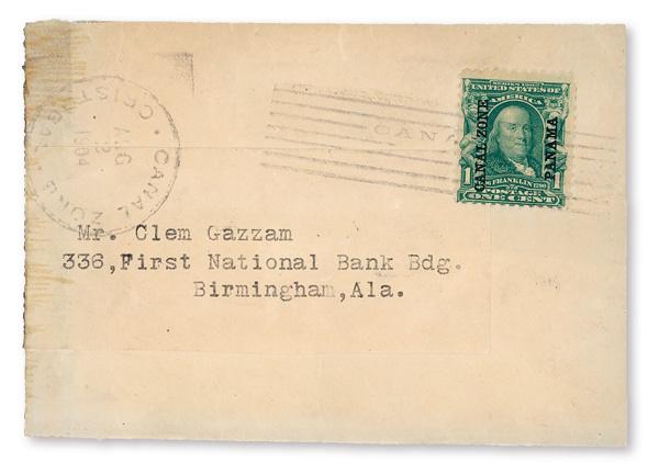 1904, 1¢ Franklin, blue green (Scott 4), bright, clean single on wrapper to Birmingham, Ala., tied by seven-bar "Canal Zone" postmark with Cristobal Aug. 2, 1904 c.d.s. at left, Very Fine. The earliest known wrapper use in the Canal Zone, and the only known example of #4 used to pay this rate.(Image)