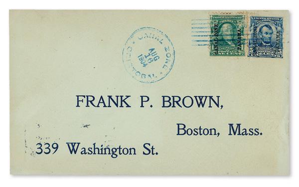 1904, 5¢ Lincoln, blue (Scott 6), with 1¢ Franklin (#4) tied by blue seven-bar "Canal Zone" postmark with matching Cristobal Aug. 16, 1904 c.d.s. alongside, on cover to Boston with pre-printed address; Boston Aug. 24 receiver on back; stamps with slight discoloration from adhesive, otherwise a sound, fresh cover, nearly Very Fine, with 1969 A.P.S. certificate. (Image)