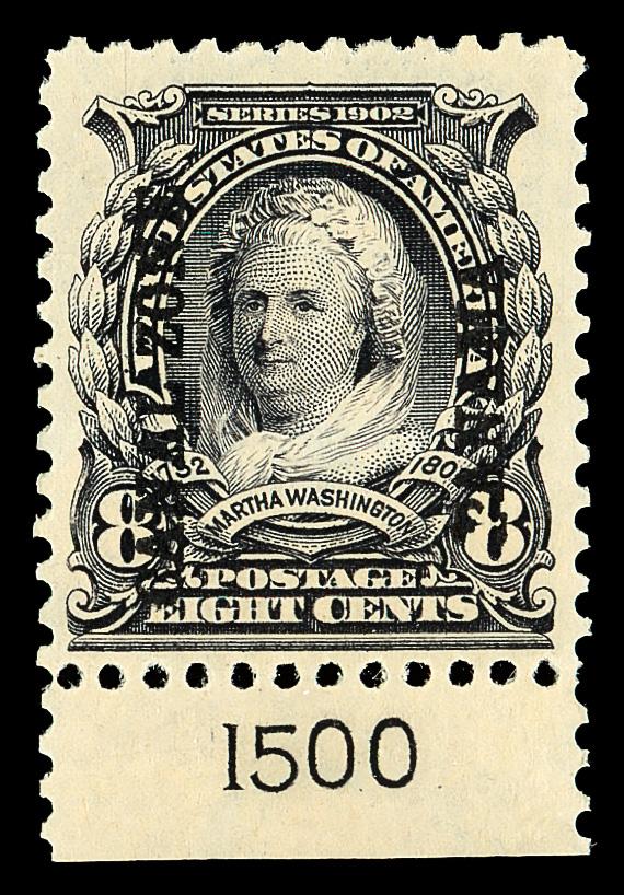 1904, 8¢ Martha Washington, violet black (Scott 7), bottom margin plate number 1500 single, o.g., never hinged, sound and Post Office fresh with deep color, sharp lines, and bright paper, Very Fine to Extremely Fine, a difficult stamp, particularly with fresh gum, with 1979 P.F. certificate. Scott $130 as hinged. (Image)