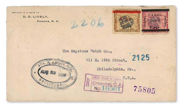 1905, 8¢ on 50c Map, bister brown (Scott 18), with #17a, each with segmented cork cancel, on corner card Registered envelope to Philadelphia; "Sta. A, Ancon. C.Z./Aug 22 1906/Registered." black double-oval and violet boxed "R/United States of America/Cristobal, C.Z." handstamps below; Cristobal "Reg. Div. Rec'd" origin (Aug. 22), New York double-oval transit (Sept. 1) and Philadelphia receivers (Sept. 2 and Sept. 3) on reverse, Fine to Very Fine. (Image)