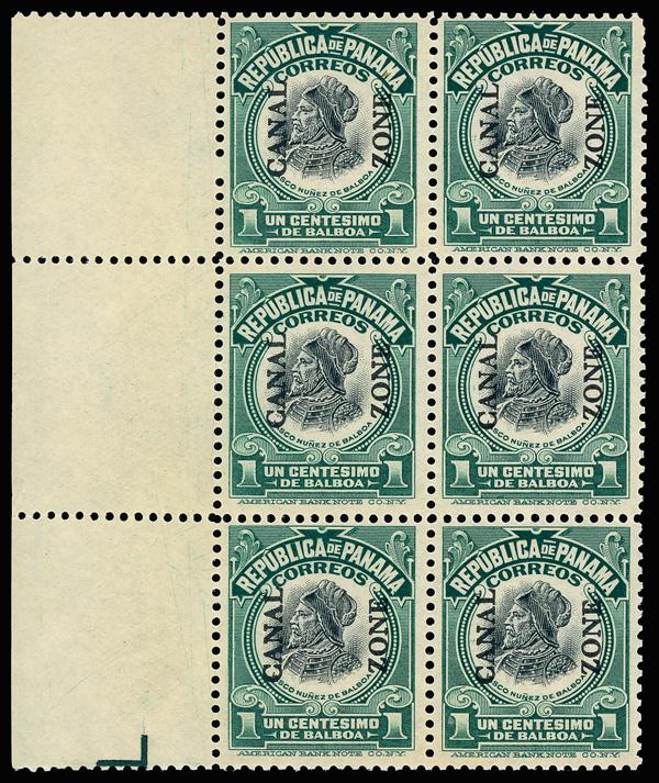 1909, 1c Balboa, dark green & black, type I overprint (Scott 31), left margin vertical block of 6, o.g., never hinged, sound with bold color and attractive centering, Fine to Very Fine or better. Scott $26 as hinged. (Image)