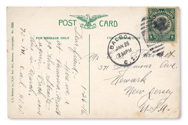 1915, 1c Balboa, green & black, type III overprint (Scott 46), Mount Hope printing, tied by Balboa duplex of Jan. 26, 1916, on I.L. Maduro, Jr. picture post card to Newark, New Jersey; picture side depicts, in color, five US submarines dry docked in Gatun Lock chamber; small area of loss to picture from previous mounting, stamp lightly toned, otherwise fresh, Fine to Very Fine. Scott $175. (Image)