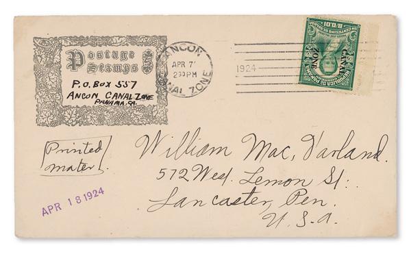 1924, 1c Vallarino, Mount Hope type III overprint (Scott 67), left margin single tied by Ancon Apr. 7, 1924 seven-bar cancel in black, on pretty corner card envelope sent Printed Matter to Lancaster, Pen.; violet straightline "APR 18 1924" receiver at lower left; a near-pristine cover, illustrating that US domestic rates applied to Possessions as well, including the Canal Zone (Postal Bulletin, June 6, 1904), Very Fine, and a great rarity as Printed Matter use.(Image)