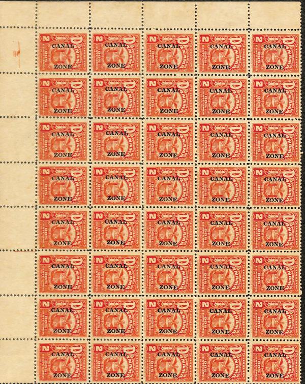 1924, 2c Arms of Panama, carmine (Scott 69), bottom left block of 40, o.g., never hinged (some toning), face-fresh with vivid color and bold overprints; creasing and separations, Fine to Very Fine. Scott $296 as blocks & singles. (Image)