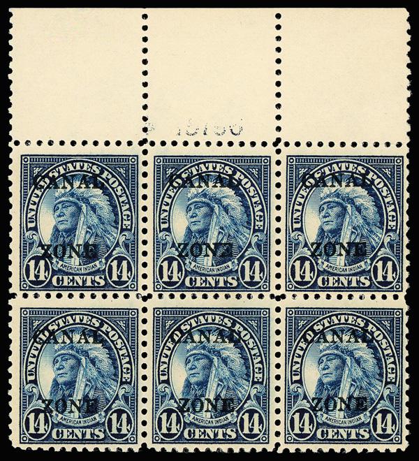 1928, 14¢ American Indian, sharp "A" (Scott 89), full top margin plate number F15796 block of 6, slightly tropicalized o.g., with deep lines and intense color on bright white paper; few perforation separations between selvage and position 3, Fine to Very Fine. Scott $350. (Image)