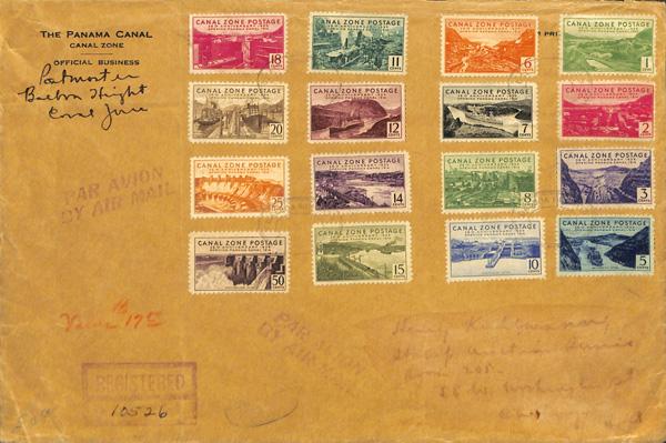 1939, Canal Anniversary complete (Scott 120-135), set of 16, on large Registered Airmail "The Panama Canal/Canal Zone/Official Business" corner card envelope addressed to Chicago, Ill.; "Postmaster/Balboa Height [sic]/Canal Zone" manuscript below corner card; stamps fresh and tied by light "Balboa Heights/Canal Zone" double-oval cancels; properly backstamped including origin postmark of Sept. 16, 1939; 1¢ wrinkled due to corner placement, 18¢ with light soiling, still an attractive use, Fine to Very Fine. Scott $300. (Image)