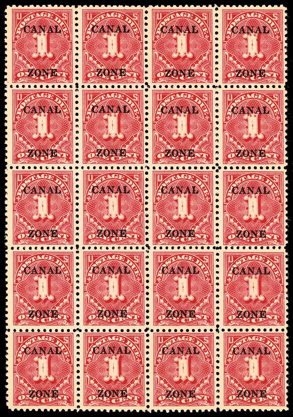 Postage Due, 1925, 1¢ carmine rose (Scott J18), three blocks, a never hinged vertical block of 20, never hinged vertical block of 24, and no gum top left corner vertical block of 20 with plate number 13844, all fresh-faced with intact perforations; the no gum block of 20 with gum toning residue on bottom eight, folded along a few horizontal rows, generally Fine to Very Fine, fully imaged online. Scott $554 for o.g. singles & blocks. (Image)