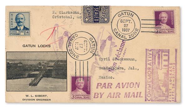 Post Office Seal, 1917, slate violet (Scott OX3), over top of illustrated Gatun Locks cover addressed to Guadalajara, Mexico; franked by #110 (2) and 117, tied by double-ring "Gatun/Sept./27/1937/Canal Zone" four-bar postmarks, the front with violet bilingual "By Air Mail" and pictorial "Commemorative/First Lockage/Sept. 26-27, 1913" handstamp plus two purple Mexican pointing hand "Return to sender" handstamps and bilingual unclaimed handstamps; reverse with two additional commemorative handstamps, plus Guadalajara receiver (Sept. 30), second postmark dated Oct. (1?), "Pregonada [Advertized]/-1.OCT.1937" handstamp, and "Lista" postmarks of Oct. 2 and Nov. 1; a fun cover for the auxiliary markings enthusiast, nearly Very Fine. Scott $250. (Image)