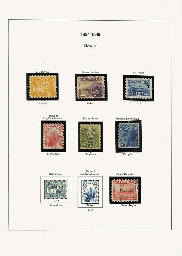 U.S. Possessions, Coveted Possessions, 1861-1946, album pages containing Hawaii, Canal Zone, Philippines, Guam, and Cuba; Hawaii includes #30-47, 56-59 unused, 72 unused, 74-79, O4 unused, plus two dozen duplicates on a stock page (with bonus Liberia on the back); Canal Zone #27, 29, 59 unused, 65 unused, 78 and 79 unused, 104 unused, 136-140 mint, J25-J29 mint, C1-C20 mint, CO1-CO7, plus some mint postal entires; Cuba 221-225, J2; Guam 1 and 2 unused, M2-M11 unused; andPhilippines 227 (2) mint, 241-241, 245, 256, 267, 383-392 mint, C59-C62 mint; attractive, Fine to Very Fine. Shipping charges apply - weight 1.4 lbs. (PDF for this Lot) (Image)