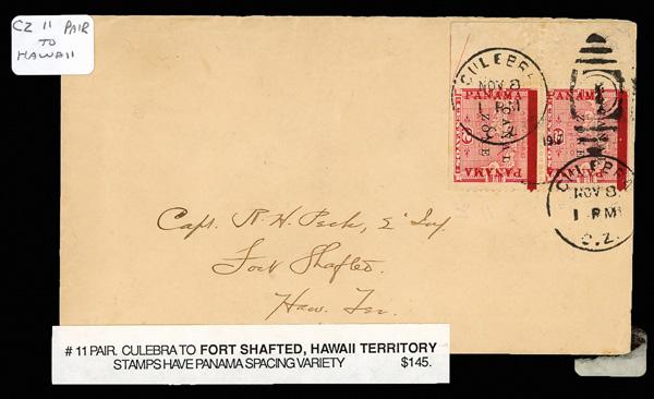 Canal Zone, Better Postal History Collection, 1906-31, 36 attractive Canal Zone franked mail individually sleeved and annotated with catalog numbers and estimated value; Registered mail from Ancon to Winnipeg; postal entire with US 1¢ used to pay Postage Due forwarding charge, hotel advertising addressed to brewing firm in Chicago, #33 used to move Maduro postcard to Germany, entire cover advertising (on reverse) in Greek to firm in New York, mystery message ship postcard, scarce Fort Sherman hand cancel reversed dater, well struck WWI military censorship cancel, pair of #71 and pair of 79 on Registered envelope with "Spamp Topics" magazine on reverse, WWII Patriotic with censor tape, QSL card from US Submaine Base at Coco Solo, Firestone Tire & Rubber advertising, C1 pair on FDC, C4 pair on FDC addressed to Roessler, #C14 single usage on small cover, CZ J15 pays Postage Due on unpaid drop mail, CZ J25 on 1¢ underpaid from US, U13 error (oil or dirt filled lower portion of postal entire die) on commercial mail to Washington, UC2 and C3 on flight to Philadelphia, #136 used on U10 to make up 1 ½¢ Bulk Rate, #5 Isthmian Canal Commission official mail with red Ancon cancel, #11 pair Culebra to Fort Shafted Hawaii Territory (stamps have Panama spacing variety), 117a complete pane on censored Airmail to New York, UC2a and C3a addressed to New Hampshire, 16b pair earliest reported usage, and more; conservative retail over $2,000, Fine to Very Fine. Shipping charges apply - weight 1 lbs. (PDF for this Lot) (Image)