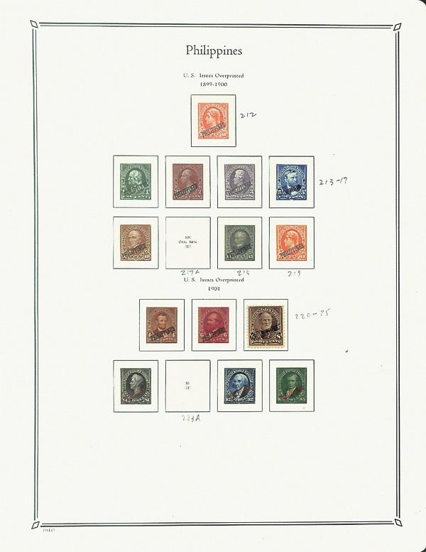 Philippines, Mostly Mint Prized Possession, 1901-1940, Palo hingeless pages with mostly mint; includes #222, 258, 264, 265, 267, 269, 271, 292, 293, 295, 296, 298, 299, 319-325, 380-389, 397-410, 425-451; Air Post C29-C35; Postage Due J1-J6, J8-J15; Official O1-O14, O15-O26, O27-O37; Japanese Occupation N1-N3, N8-N11, N12-N28, N29-N34 (plus imperforates), N35-N39; Semi-Postal NB1-NB7; Postage Due NJ1; and souvenir sheets NB4, and NB8; worth a look, Fine to Very Fine. Shipping charges apply - weight 2 lbs. (PDF for this Lot) (Image)