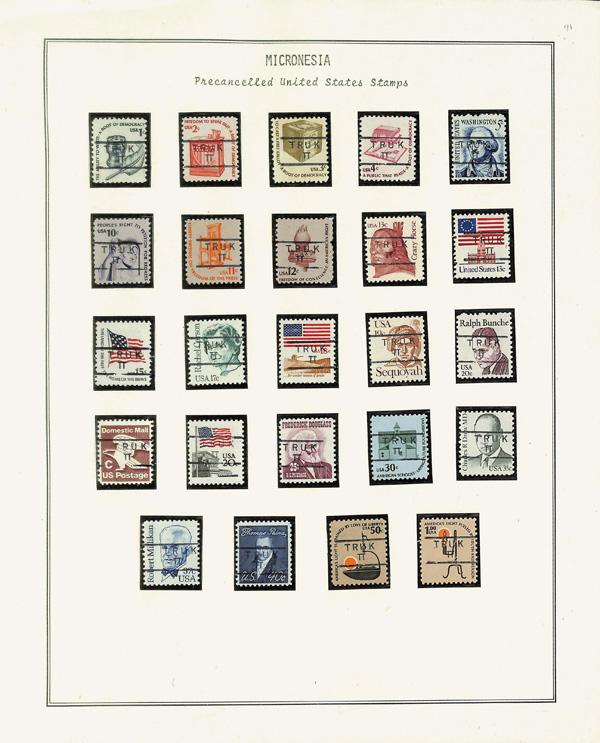 Micronesia, Precancel Collection, 1965-1992, 75 modern precancels from Truk, Koror, and Ebeye in black mounts on Scott album pages; unusual, Very Fine. Shipping charges apply - weight 0.7 lbs. (Image)