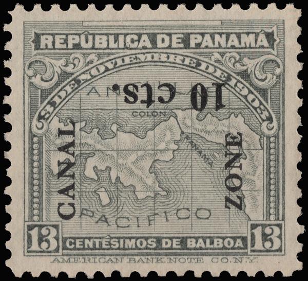 1911, 10¢ on 13c Map, gray, "10 cts." inverted (Scott 36a), o.g., lightly hinged, fresh and perfectly centered, Extremely Fine, with a 2004 P.S.E. certificate. Scott $325. (Image)
