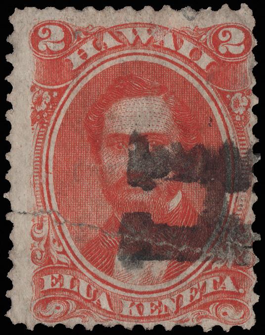 1864, King Kamehameha IV, 2¢ vermilion (Scott 31a), rare handstamped "H" cancel (Gregory H14, Davey 164, Shaffer 2-207); about 80% complete; the stamp has been torn in two and rejoined, Fine appearance. A reasonable example of this rare cancel, which has only been recorded on Scott #30b and 31a. (Image)