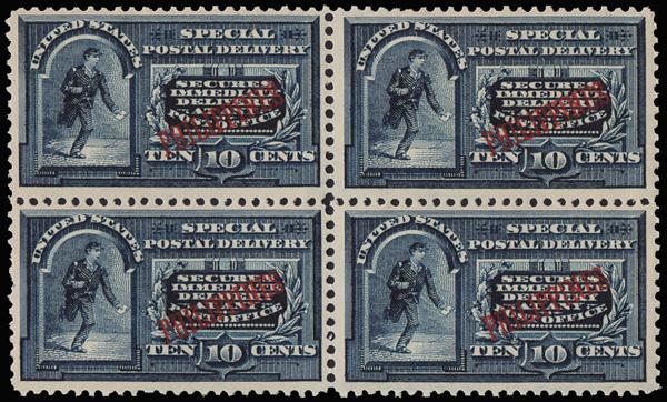 Special Delivery, 1901, 10¢ dark blue (Scott E1), a fresh mint block of 4, o.g., never hinged; lower left stamp with a couple short perfs, otherwise Fine to Very Fine. Scott $740 as singles. (Image)