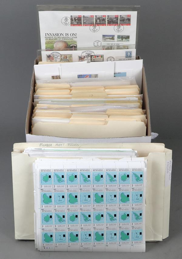 U.S. Possessions, Dealer's stock of Pacific Isles 1994-2023, Bankers Box packed with manila folders brimming with thousands of new issues from Palau, Marshall Islands, and Micronesia; while some issues had mild to moderate duplication, we did note over 200 sheets of Inauguration of Postal Service (#48-51) Micronesia overprint (22¢ over 20¢) with at least half with misplaced or multiple surcharges; perfect opportunity for the online retailer, Very Fine. Shipping charges apply - weight 23.6 lbs. (Image)