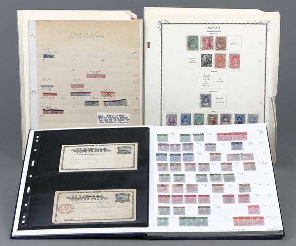 Hawaii, "The Big Island" Copious Stock of Mint & Used, 1864-99, In one binder on black stocksheets, excellent stock of many hundreds with many better throughout; highlights include mint #34 (2), 36, 46, 64 (2), 71 (3), 73, O1-4, O5 (3), O6, used 34 (11), 36, 46 (2), 47 (3), 48-49, 64, and many more including about 20 postal cards with such better as used UX1, and unused UX1-2, U5, UX8-9, as well as Scott-listed & unlisted revenues, like the ones for the Kahului Railroad Company, U.S. stamps with Hawaii precancels, some early forgeries, cut squares, specimens, reprints, and a couple of late covers with mixed frankings of U.S. stamps. In addition, a small bit of Canal Zone, Cuba, D.W.I. and Puerto Rico, overall Fine to Very Fine, viewable in its entirety online. Shipping charges apply - weight 3.6 lbs. (PDF2 for this Lot) (Image)