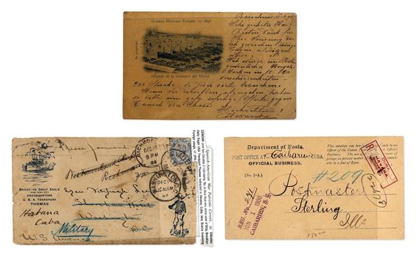 Cuba, 1898-1900, Spanish American War postal history, 47 covers and postal cards and a wrapper, covers including Gibraltar to General Fitzhugh Lee in DC and forwarded to Cuba, semi-official registered cover with Cuba Registry label, many soldier's letters with military station cancels and interesting handstamps including regimental, one with left edge hand stitched closed (sender forgot something and had no tape), variety with different Cuban towns, couple with contents, one all over flag patriotic, postal cards including Spain to Hungary with Spanish American war image on message side, plus a wrapper with "U.S.S. Yorktown Sailor's Letter (and signature of the) Lt. Commander, Comd'g" handstamp on reverse, also includes an unused entire and two postwar covers, fully imaged online and well worth the time to view, ex J. Leonard Diamond. Shipping charges apply - weight 2.4 lbs. (PDF for this Lot) (Image)