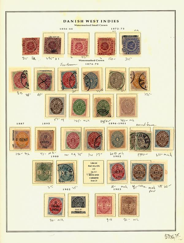 Danish West Indies, Nearly Complete Mint & Used Collection, 1856-1917, On Scott pages with all stamps in clear mounts; highlights include used #1, 1a, 5-10, 12 (thin), 43-50, J4, and mint 3, 4 (no gum), 11, 14, 20, 31-39. Condition varies, but on the whole Fine to Very Fine, photographed in full. Shipping charges apply - weight 0.6 lbs. (Image)