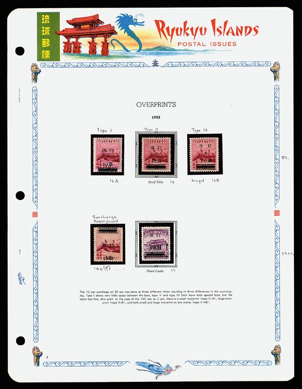 Ryukyus, Beyond Complete All-Mint Collection, 1948-72, In a White Ace album with all stamps in black mounts, not only is this complete, and yes, that includes the first printing of the inaugural set (#1a-7a) as well as a NH example of #17 with a PF cert, but also 16f, which has a transposed surcharge and also comes with a PF cert, nearly complete provisionals for the Miyako District including 3X3-4, 3X6-8, 3X10-13, 3X15, 3X17-18, 3X20-21, 3X25, 3X28, 3X28a, 3X29-31, 3XR1-7, and the first two sets of federal revenues mint, R1-8 & R9-16, generally Fine to Very Fine, additional images online. Shipping charges apply - weight 3 lbs. (PDF2 for this Lot) (Image)