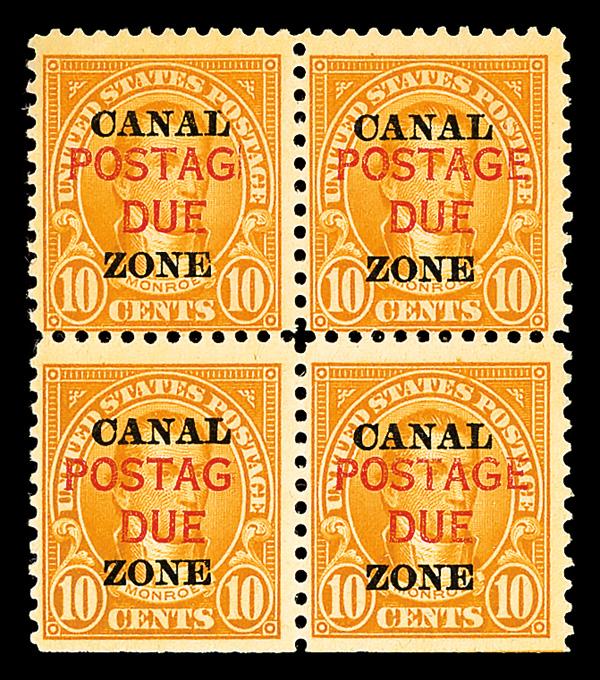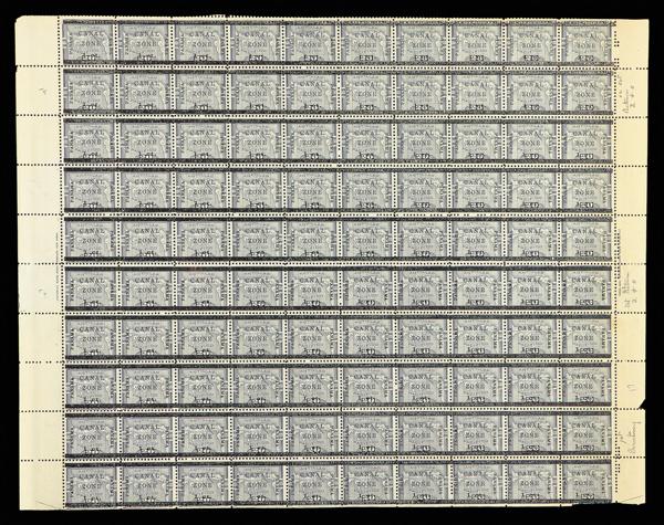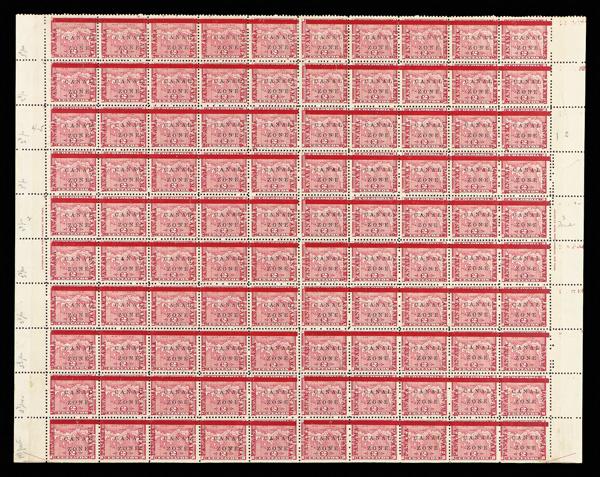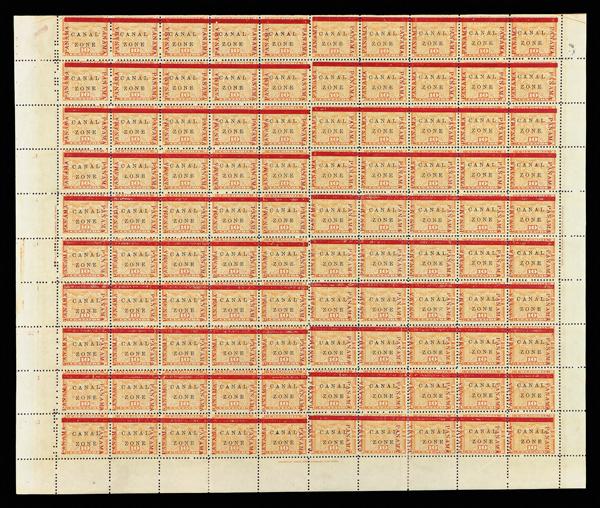 1904, 10c Map, yellow (Scott 13), bottom full pane of 100 with three American Bank Note Company imprints, slightly disturbed o.g., wondrously fresh with unblemished color, position 26 with "CANAL" and 48 with "ZONE" in antique type (#13a (200 issued), 13b (400 issued) respectively); tiny faults, Fine+, with 2023 P.S.E. certificate. Scott $2,757 as singles & blocks. (Image)