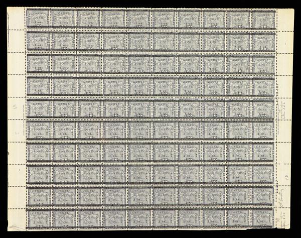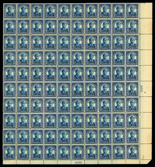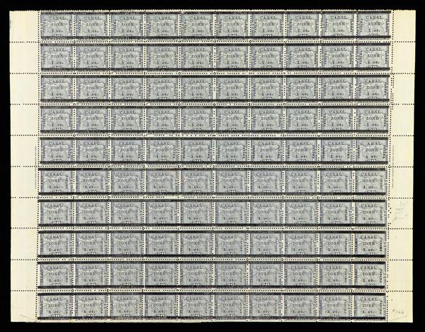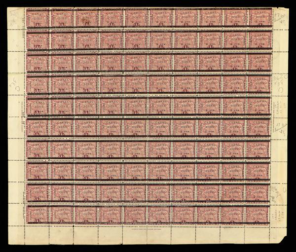 1904, 1¢ on 20c Map, violet, surcharge type "b" (Scott 16a), top full pane of 100 with two American Bank Note Company imprints, disturbed o.g., with clean color and clear impression, "2nd printing" penciled in selvage; small faults, top selvage missing, Fine to Very Fine, with 2023 P.S.E. certificate. Scott $213 as blocks of four. (Image)
