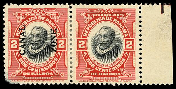 1918, 2c Córdoba, vermilion & black, type IV overprint, horizontal pair, right stamp without overprint (Scott 53b), disturbed o.g., with right sheet selvage, fresh and nicely centered; left stamp with thin (damaged lower left corner), otherwise Very Fine, with 2019 P.S.E. certificate. Scott $2,000. (Image)