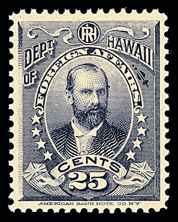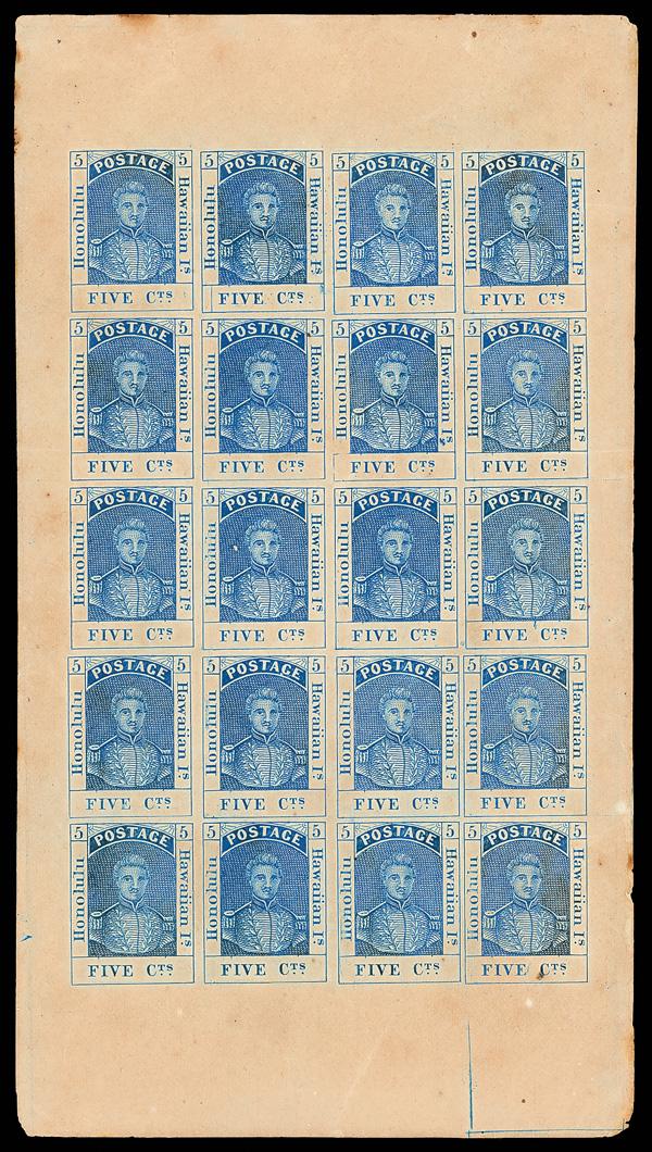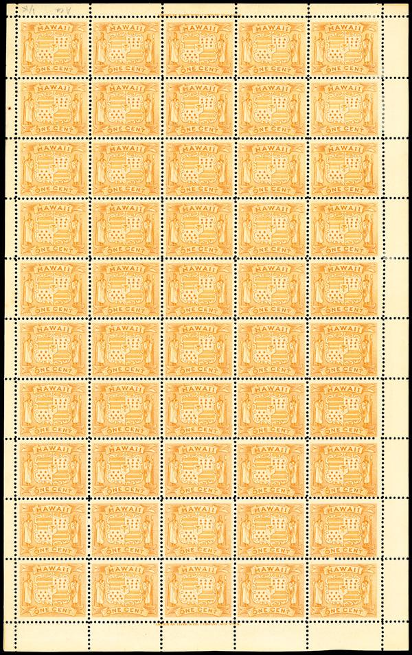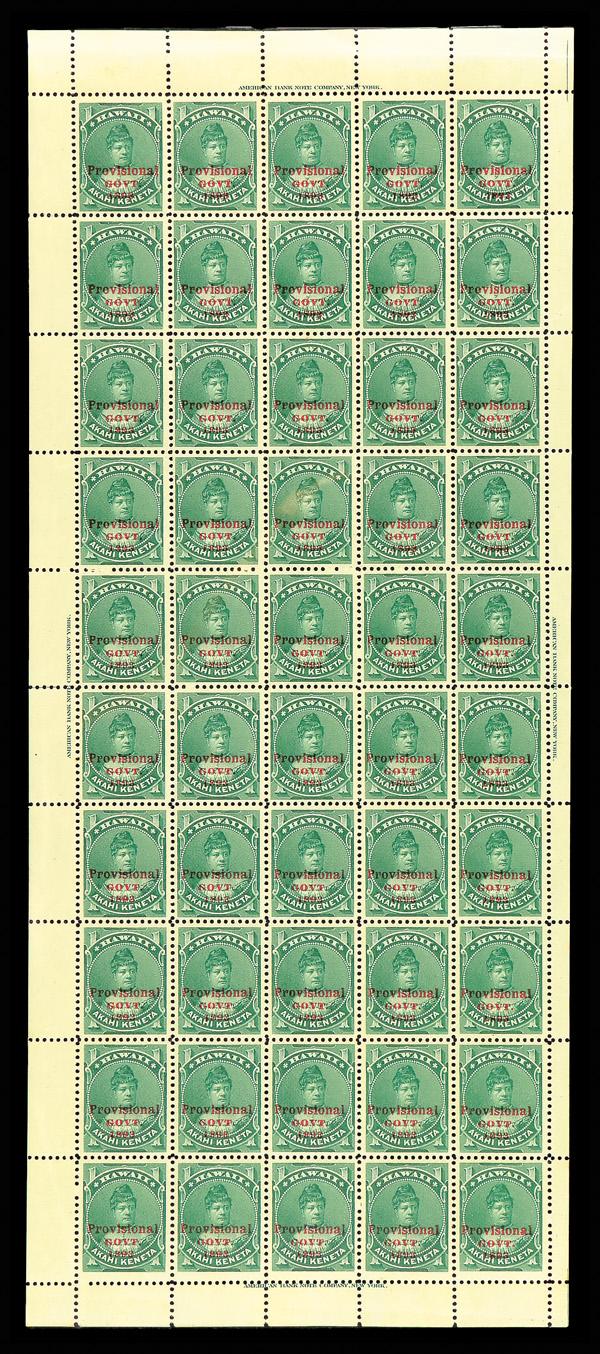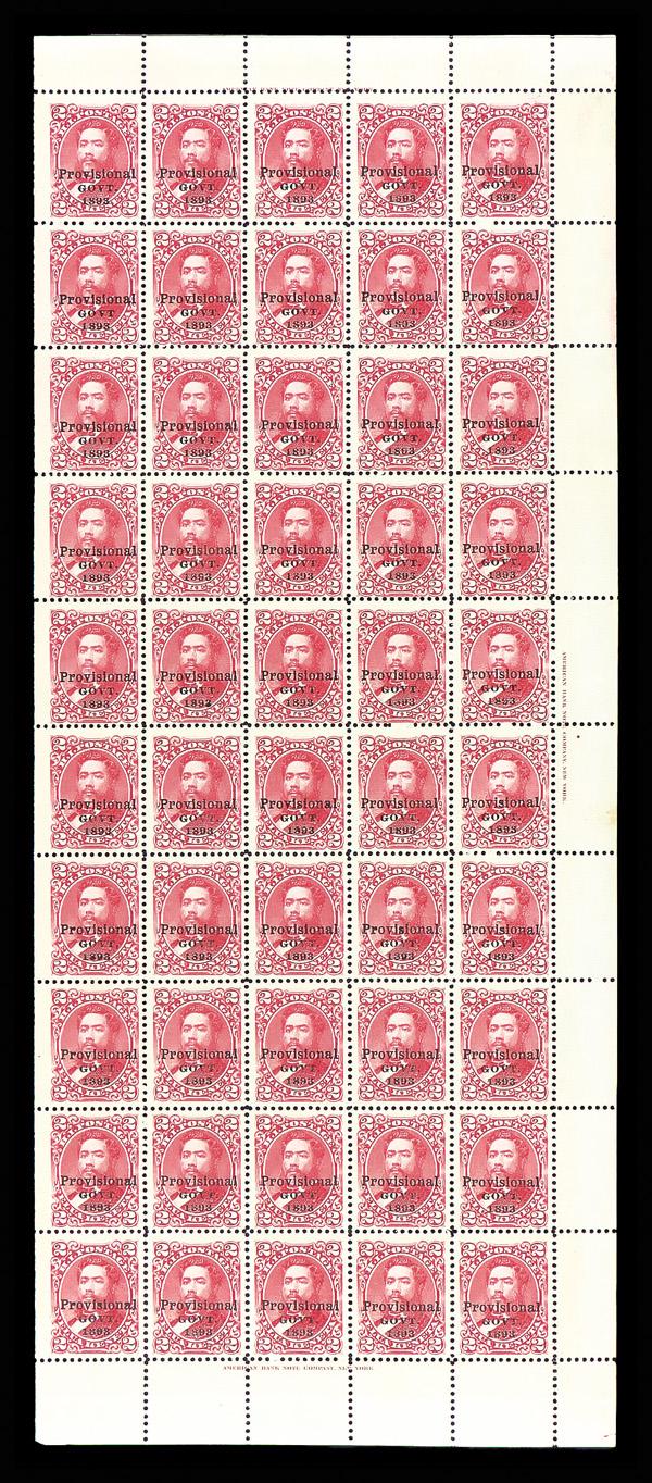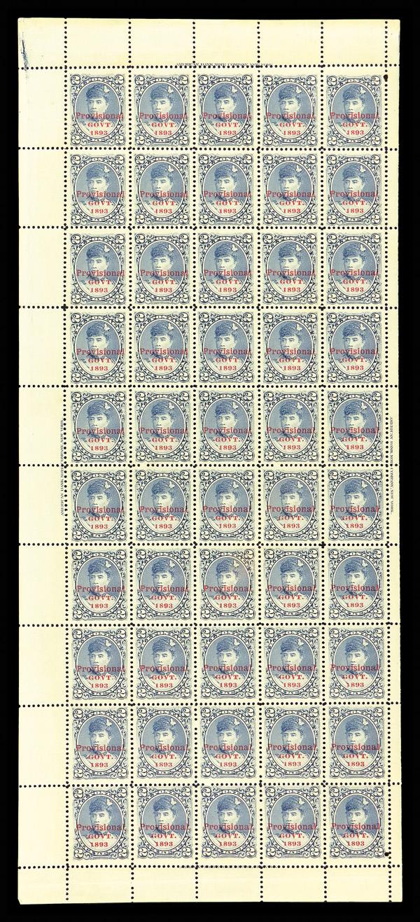 1893, Provisional Govt., 1¢ blue, red overprint (Scott 54), left full pane of 50 with American Bank Note Company imprint in each selvage, o.g., never hinged, crisp and clean with attractive color on fresh paper; horizontal separations between positions 21 & 26; positions 5 & 50 with punched holes, Fine to Very Fine, with 2019 P.S.E. certificate. Scott $1,050 as singles. (Image)