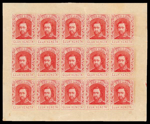 Kahului Railroad, 1894, 18¢ black (Meyer-Harris 154), complete sheet of 50, unused without gum, with proof-like presentation on fresh paper; tape-sealed tear in top selvage not affecting stamps, Fine to Very Fine, with 2022 P.S.E. certificate. (Image)