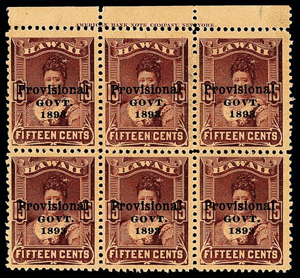 1893, Provisional Govt., 15¢ red brown, black overprint (Scott 70), top margin imprint block of 6, o.g., never hinged, eye-catching positional with rich, deep color; top center stamp with two pinholes at top right, Very Fine, with 2019 P.S.E. certificate. Scott $330 as singles. (Image)
