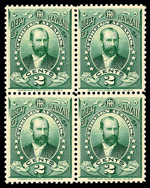 Official, 1896, 2¢ green (Scott O1), block of 4, o.g., never hinged, pristine with rich color and clean detail, Very Fine to Extremely Fine. Scott $360 as singles. (Image)