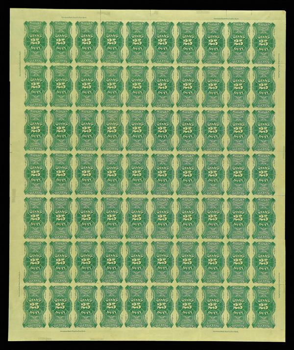 Revenue, 1877, 25¢ green (Scott R1), complete sheet of 70 with eight American Bank Note Company imprints in selvage, fresh-faced with crisp detail in solid color; three stamps in bottom row hinged, the rest never hinged; hinge reinforcements in selvage and spots of staining on the gum, Fine to Very Fine, with 2022 P.S.E. certificate as hinged. Scott $2,253 as singles. (Image)