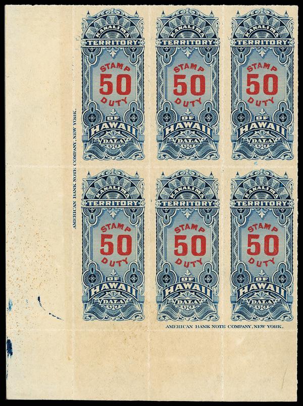 Revenue, 1901, $50 slate blue & carmine (Scott R12), bottom left corner margin block of 6 with imprints on selvage, o.g., never hinged, Very Fine, with 2008 P.F. certificate. Scott $720 for singles. (Image)