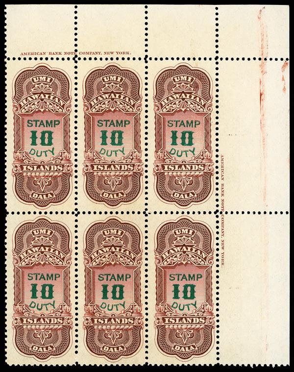 Revenue, 1910, $10 reddish brown & green (Scott R16), top right corner margin block of 6 with two imprints on selvage, o.g., never hinged, previously hinged in selvage only, Very Fine, with 2025 P.S.E. certificate. Scott $450 for singles. (Image)
