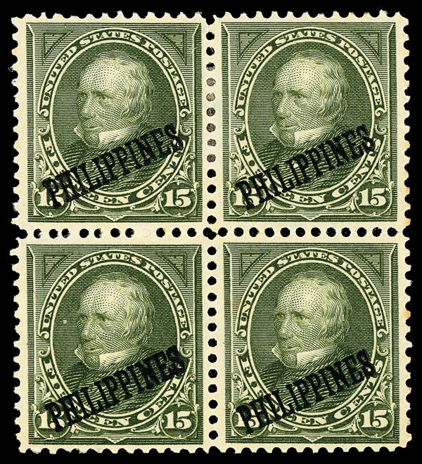 1899, 15¢ olive green (Scott 218), block of 4, fresh with robust color and intact perforations; top stamps hinged, bottom never hinged; right stamps especially choice, Fine to Very Fine or better, with 2021 P.S.E. certificate. Scott $270 as singles. (Image)