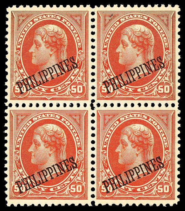 1899, 50¢ orange (Scott 219), block of 4, sound with solid perforations and clean impression; top stamps lightly hinged, bottom never hinged; faint oxidation along top of top stamps, Very Fine, with 2017 P.S.E. certificate. Scott $850 as singles. (Image)