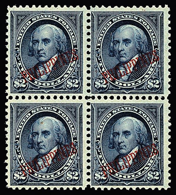 1901, $2 dark blue (Scott 224), block of 4, o.g., never hinged, fresh and bright with deep color, clean lines, and like-new paper; sound, Fine to Very Fine, with 2018 P.S.E. certificate. Scott $4,600 as four singles. (Image)