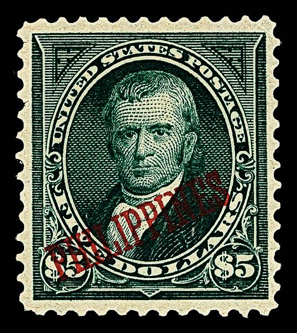1901, $5 dark green (Scott 225), o.g., hinged, fresh and clean with solid color and detail; tiny tear at upper left, otherwise Very Fine, with 2019 P.S.E. certificate. Scott $500. (Image)