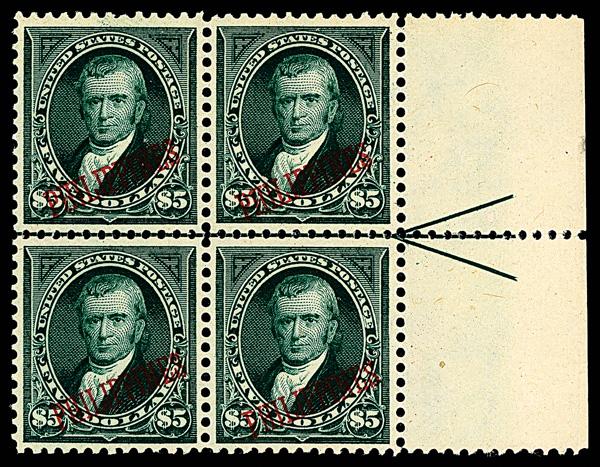 1901, $5 dark green (Scott 225), right margin arrow block of 4, disturbed o.g., a stellar positional, fresh as the day it was printed, with bold color and crisp detail, bright front and back, Very Fine to Extremely Fine, with 2022 P.S.E. certificate graded VF-XF 85. SMQ VF-XF 85. Scott $3,000. (Image)