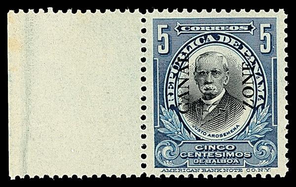 1915, 5c Arosemena, deep blue & black, type III overprint (Scott 48), left margin single, o.g., never hinged, a gem positional with proof-like colors and detail, sound on fresh paper, Very Fine to Extremely Fine, a rare stamp this nice. Scott $425 for o.g. (Image)