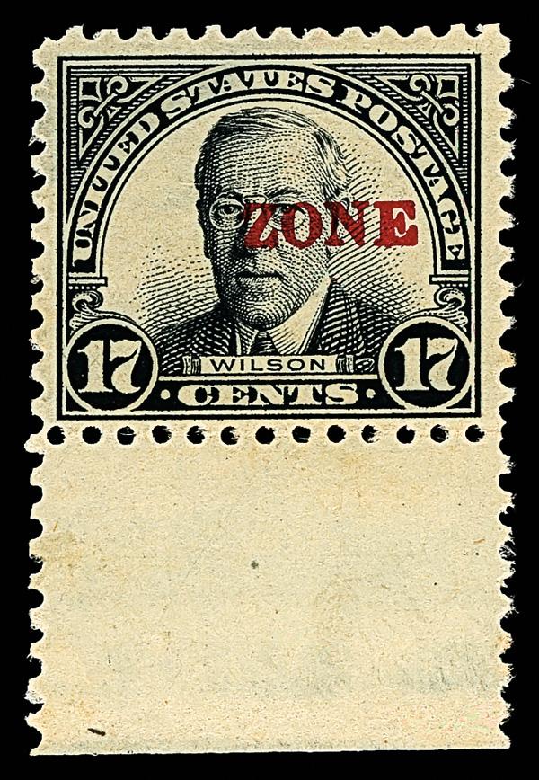1926, 17¢ Wilson, sharp "A", "ZONE" only (Scott 91a), bottom margin single, o.g., very lightly hinged, a pretty samp, crisply printed in clean color, sound and centered just to bottom, Fine to Very Fine, only 40 issued, with 1994 P.F. certificate. Scott $1,000. (Image)
