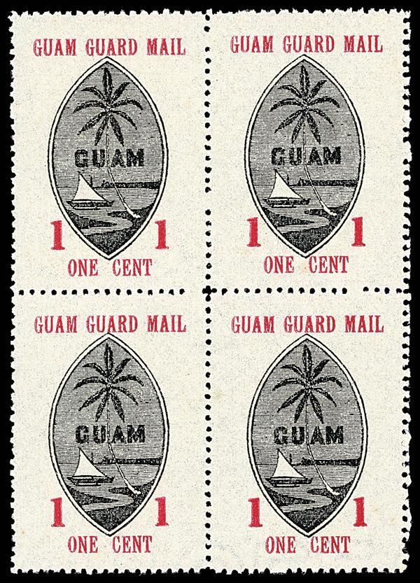 Guard Mail, 1930, 1¢ red & black (Scott M3), block of 4, without gum as issued, Post Office fresh with solid, intact perforations, the bottom stamps showing parts of "CLEV[ELAND BOND]" watermark (inverted), Very Fine, with 2001 P.F. certificate. Scott $525. (Image)