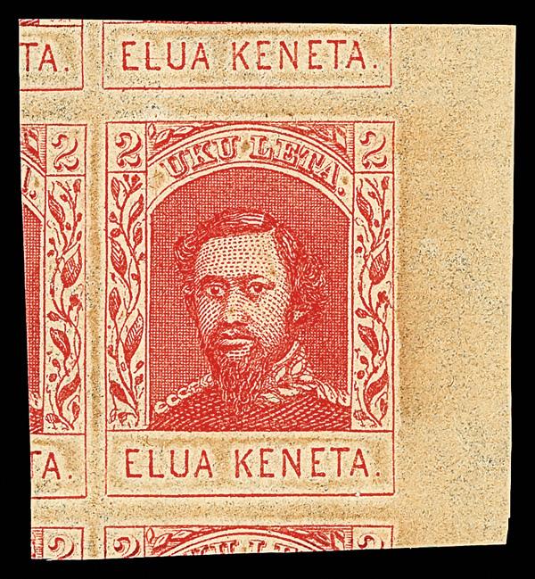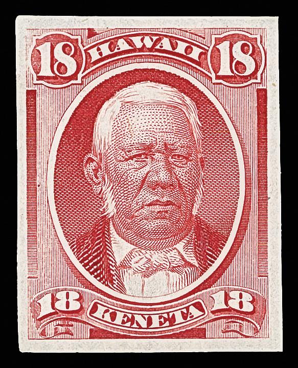 1883, Queen Emma, $1 rose red, plate proof on India paper (Scott 49P3), sound and alluring, in radiant color on matching paper, Very Fine. Scott $400. (Image)