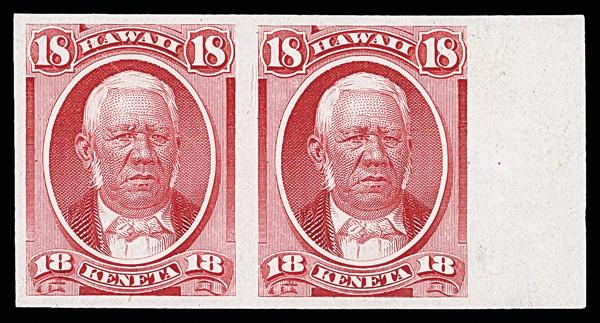 1871, Mataio Kekuanaoa, 18¢ dull rose, plate proof on India paper (Scott 34P3), right margin horizontal pair, in enticing color on glowing white India with full, balanced margins; light diagonal crease, otherwise Extremely Fine. Scott $800 as singles. (Image)